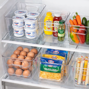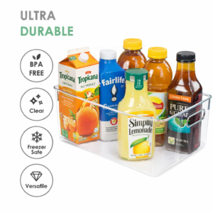 Clear and Sturdy —- Made of premium BPA free durable polyethylene material, these refrigerator organizers are lightweight and sturdy. They are clear, so you can see what you want without having to take the whole bin out of the fridge. Use side by side to create a storage solution that works best for you.