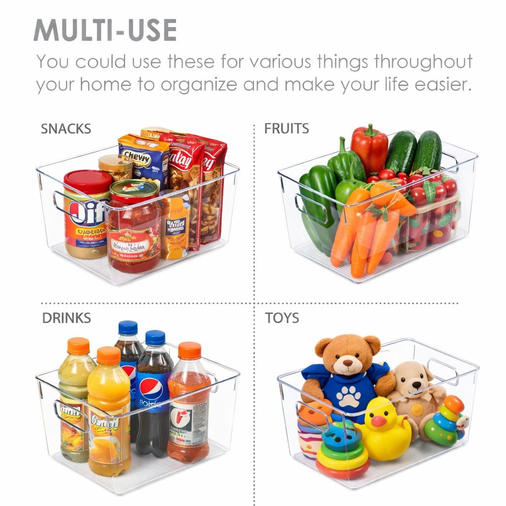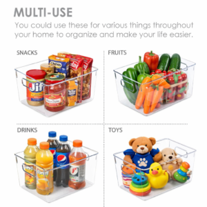Make Your Life Much Easier —- You can use these pantry bins for various things throughout your home to organize and make your life easier. They are great for creating a clean and organized refrigerator or pantry. Ideal for fruit, vegetables, drinks, yogurts, canned goods, meat. You also can use them for storing dry goods in your pantry.